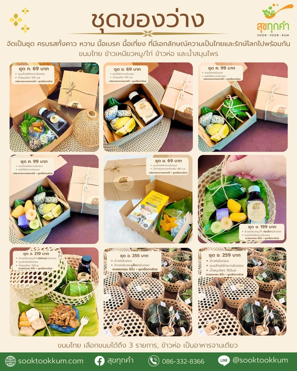 ที่ “สุขทุกคำ” ลูกค้าสามารถเลือกเมนูข้าวเหนียวหมูห่อใบตอง ได้ตามความต้องการ ทั้งชนิดข้าว เนื้อสัตว์ บรรจุภัณฑ์ และขนาด